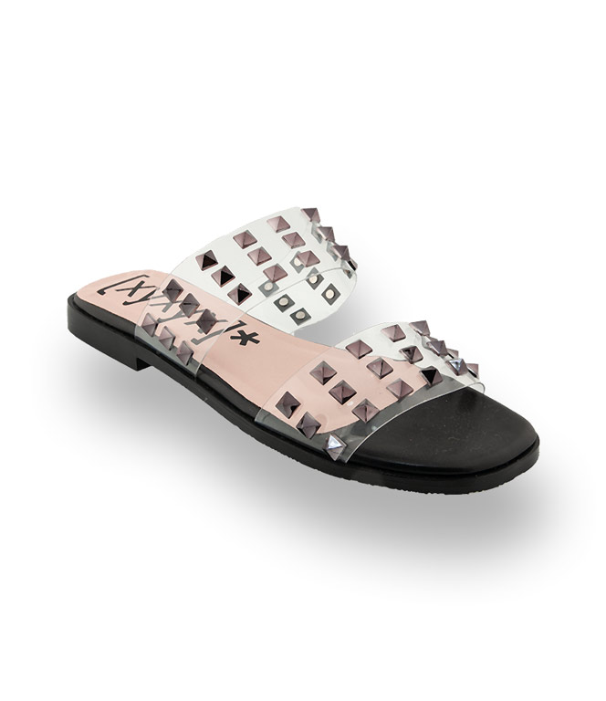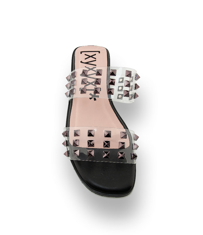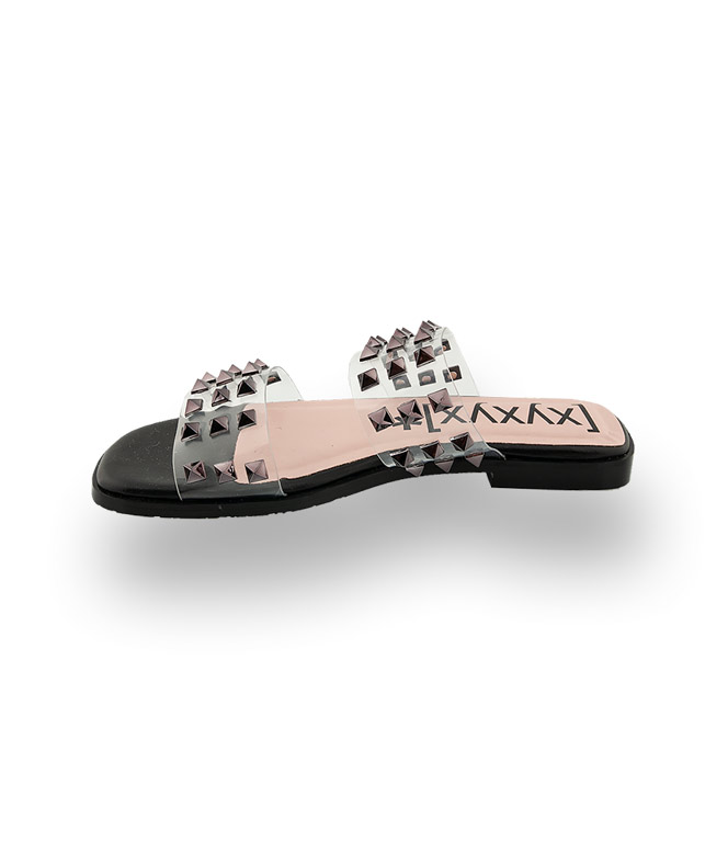 Pantolette von [xyxyx]* in schwarz mit Schmucksteinen auf Vinyl