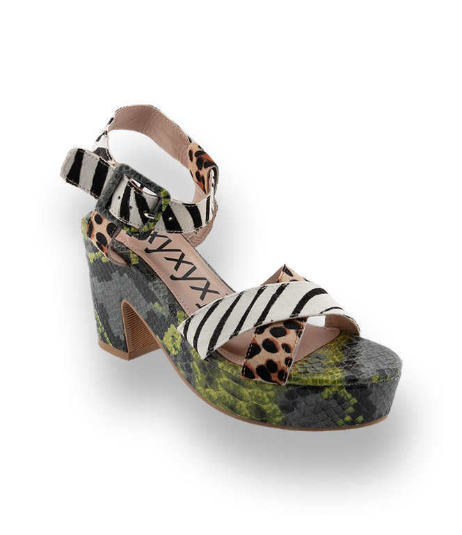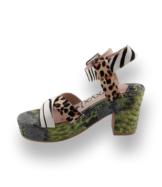 xyxyx setzt auf Materialmix und coole Farben. Plateau-Sandalen sorgen einen optimalen Auftritt und machen lange Beine. Gekreuzte Bandagen und der breite Fesselriemen in bedrucktem Kuhfell, im Animaprint, bieten sicheren Halt. Der blockige Absatz und das 3 cm hohe Plateau in glänzendem grün/grauem Reptilprint komplettieren das ausgefallene Design. Die gepolsterte Decksohle und die Gummilaufsohle sorgen für Komfort.