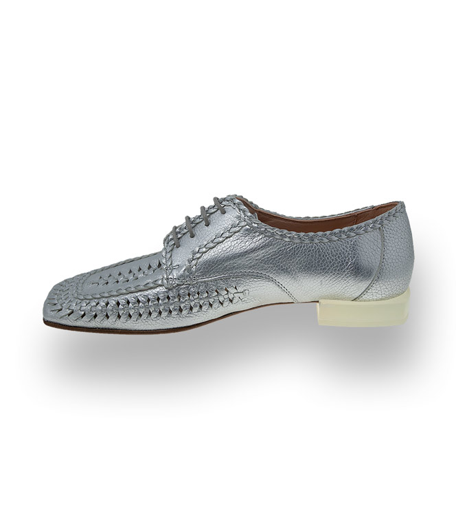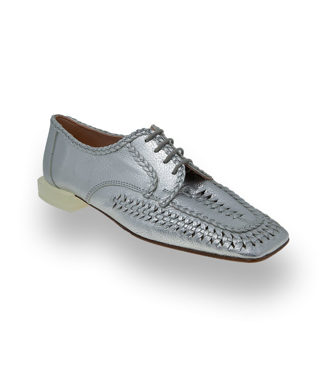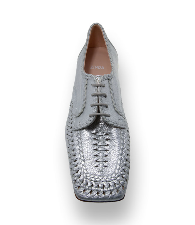 Weiches silberfarbenes Leder, Flechtung und vorallem extremer Karree. Attribute die den Schnürer von Zinda in den modischen Fokus katapultieren. Zu weiten Hosen, Schnitte im Männerstil, Oversize - Jacken und Mäntel, ein modisches Duo, dass sich herrlich ergänzt. Die neuen Ecken und Kanten zeigen sich auch am 2cm hohen Absatz. Lederfutter und eine Lederlaufsohle in bester Qualität unterstützen den Tragekomfort. Ein luxuriös gearbeitetes Keypiece macht immer und überall Eindruck.